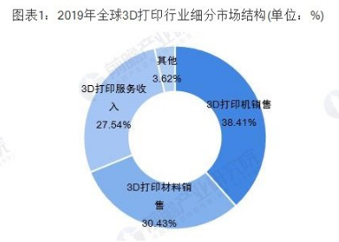 3D打印不僅可以一次單獨制造產(chǎn)品,而且還可以創(chuàng)建大量定制產(chǎn)品,這既可以節(jié)省大量的時間,減少浪費,還可以節(jié)約成本。以這種方式創(chuàng)建的產(chǎn)品也將更輕,但功能同樣強大,絲毫不遜于傳統(tǒng)方法創(chuàng)造的功能強度。根據(jù)市場研究機構(gòu)IDC預計,2019年全球3D打印的市場規(guī)模將達到138億美元,比2018年擴大21.2%。其中,53億美元來自打印機銷售,42億美元來自打印材料銷售,38億美元來自打印服務(wù)。3D打印材料的占比達到30.43%。