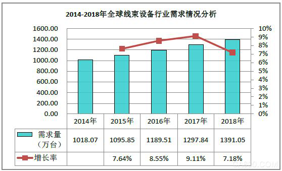 2014年全球線束設(shè)備行業(yè)需求量為1018.07萬(wàn)臺(tái),2018年為1391.05萬(wàn)臺(tái),同比2017年增長(zhǎng)7.18%。