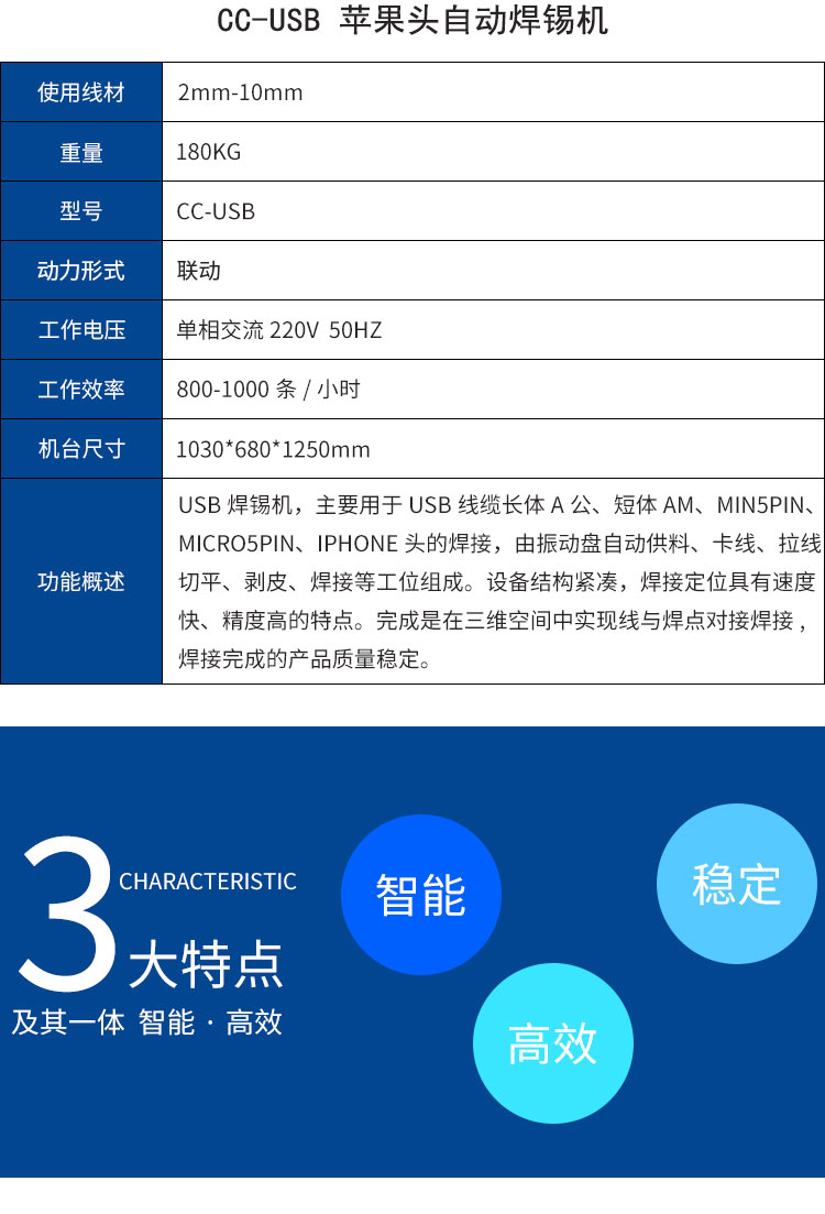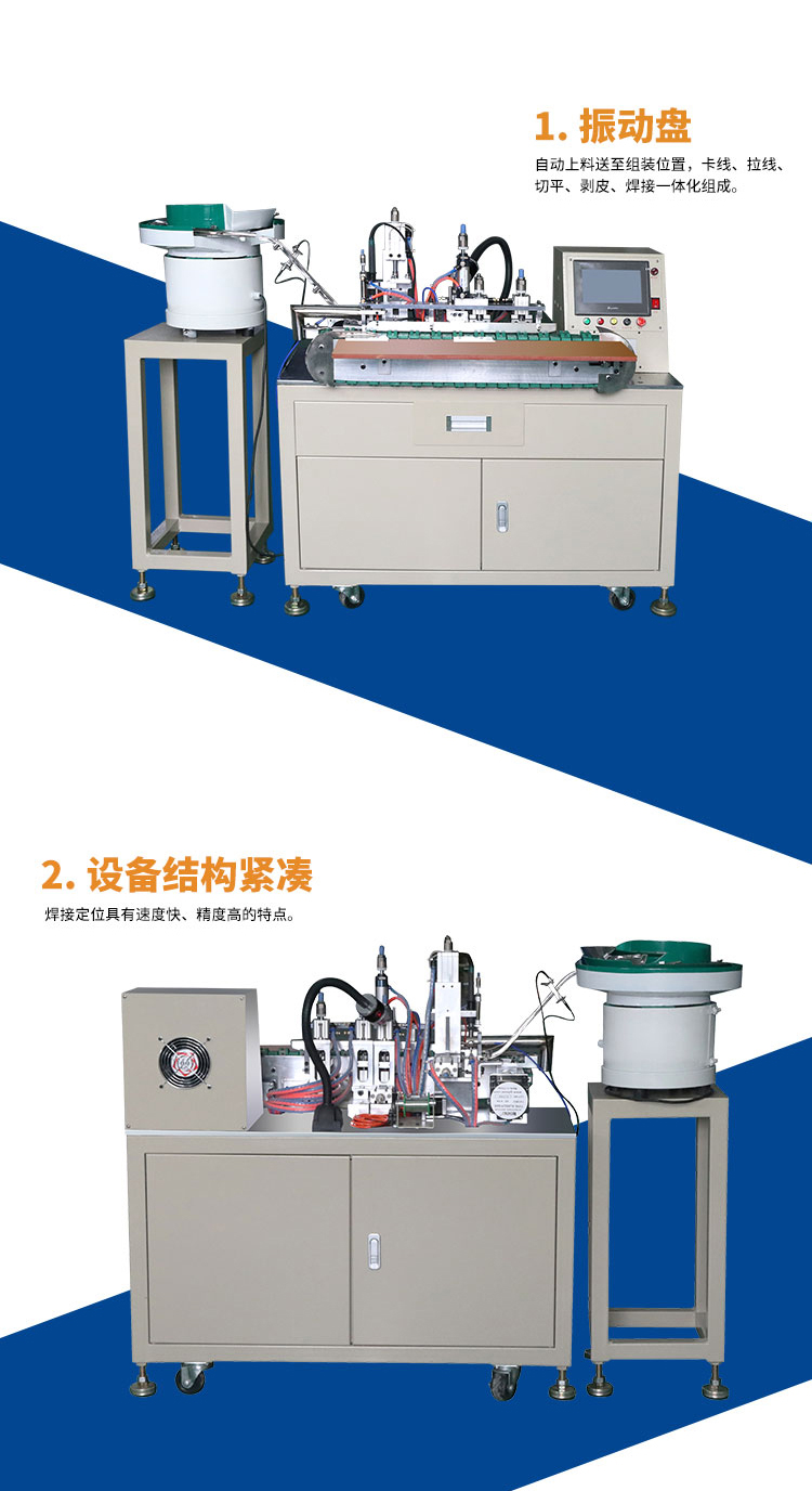 USB自動(dòng)焊錫機(jī),主要用于USB線纜長(zhǎng)體A公、短體AM、MINI5PIN、MICRO5PIN的焊接,由振動(dòng)盤自動(dòng)供料、再分線、拉線、切平、剝皮、