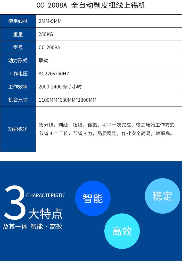 集分線,剝線,扭線,鍍錫,切平一次完成,較之原始工作方式節(jié)省4個(gè)工位,節(jié)省人力,品質(zhì)穩(wěn)定,作業(yè)安全簡(jiǎn)易,效率高。